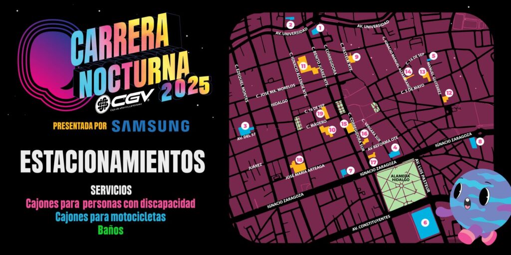 “Por instrucción del alcalde Felifer Macías, informamos que 19 estacionamientos del Centro Histórico estarán ofreciendo servicio para atender la demanda de la carrera nocturna, este sábado 8 de noviembre, con horarios de cierre entre las 12 y las 2 de la mañana y servicio de 24 horas al estarán disponibles 2 mil 450 cajones de estacionamiento, de los cuales 115 son para personas con discapacidad. Once estacionamientos se ubicarán dentro del perímetro de cierres viales, por lo que se invita a la ciudadanía a ingresar antes de las 6:30 de la tarde”, comentó.