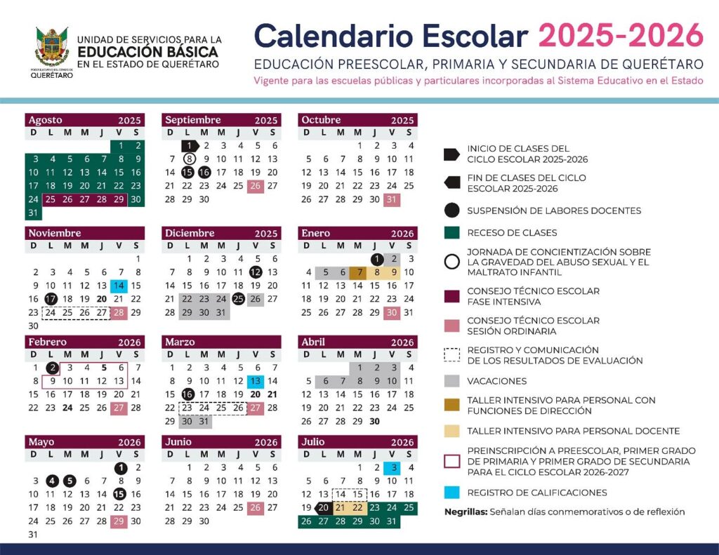 A unas semanas de que inicie el ciclo escolar 2025-2026 para las escuelas públicas y privadas de nivel básico, la Unidad de Servicios para la Educación Básica en el Estado de Querétaro presentó el calendario con el que se determinarán los días festivos, los días hábiles de clase, los periodos vacacionales y todo lo relacionado con la educación pública en el estado.